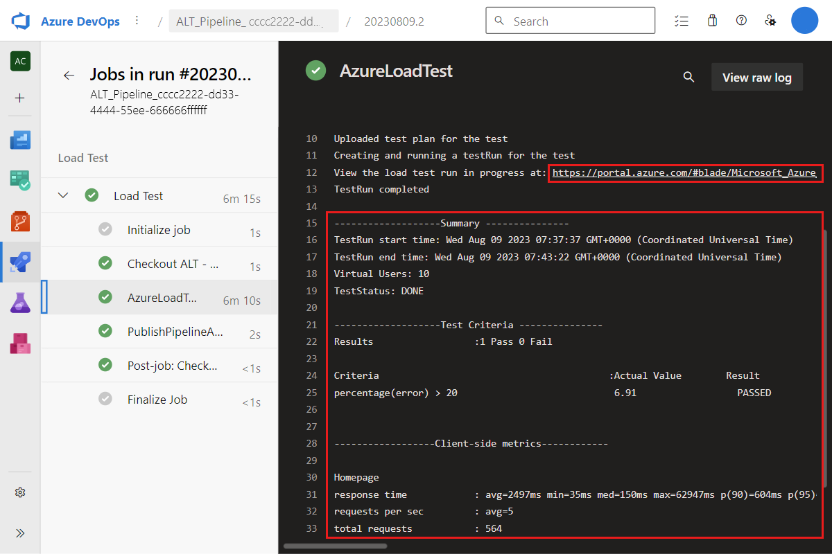 The CI/CD pipeline run now starts and accesses the Azure load testing resource to run the test.