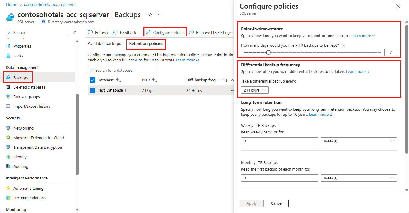 You can change the default point-in-time recovery (PITR) backup retention period and the differential backup frequency by using the Azure portal, the Azure CLI, PowerShell, or the REST API. The following examples illustrate how to change the PITR retention to 28 days and the differential backups to a 24-hour interval.