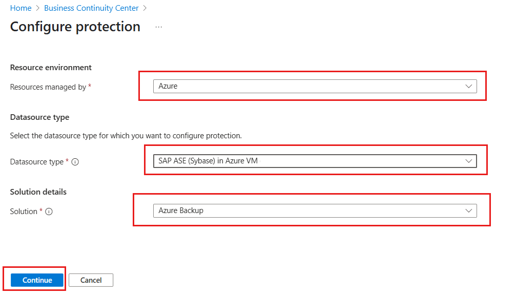 On the Configure protection pane, select Resource managed by as Azure, Datasource type as SAP ASE (Sybase) in Azure VM, and Solution as Azure Backup.