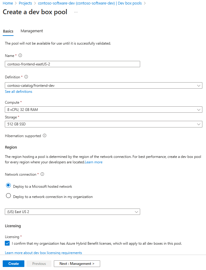 2. Select your desired deployment region for the dev boxes. Choose a region close to your expected dev box users for the optimal user experience.Licensing Select this checkbox to confirm that your organization has Azure Hybrid Benefit licenses that you want to apply to the dev boxes in this pool. on the Management tab, enter the following values:
