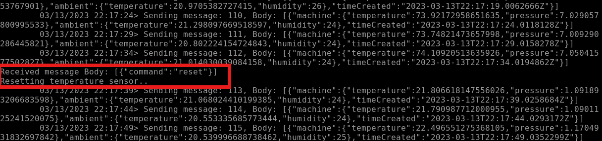 iotedge logs -f {moduleName}See how the reset command affects the SimulatedTemperatureSensor by viewing the sensor logs: