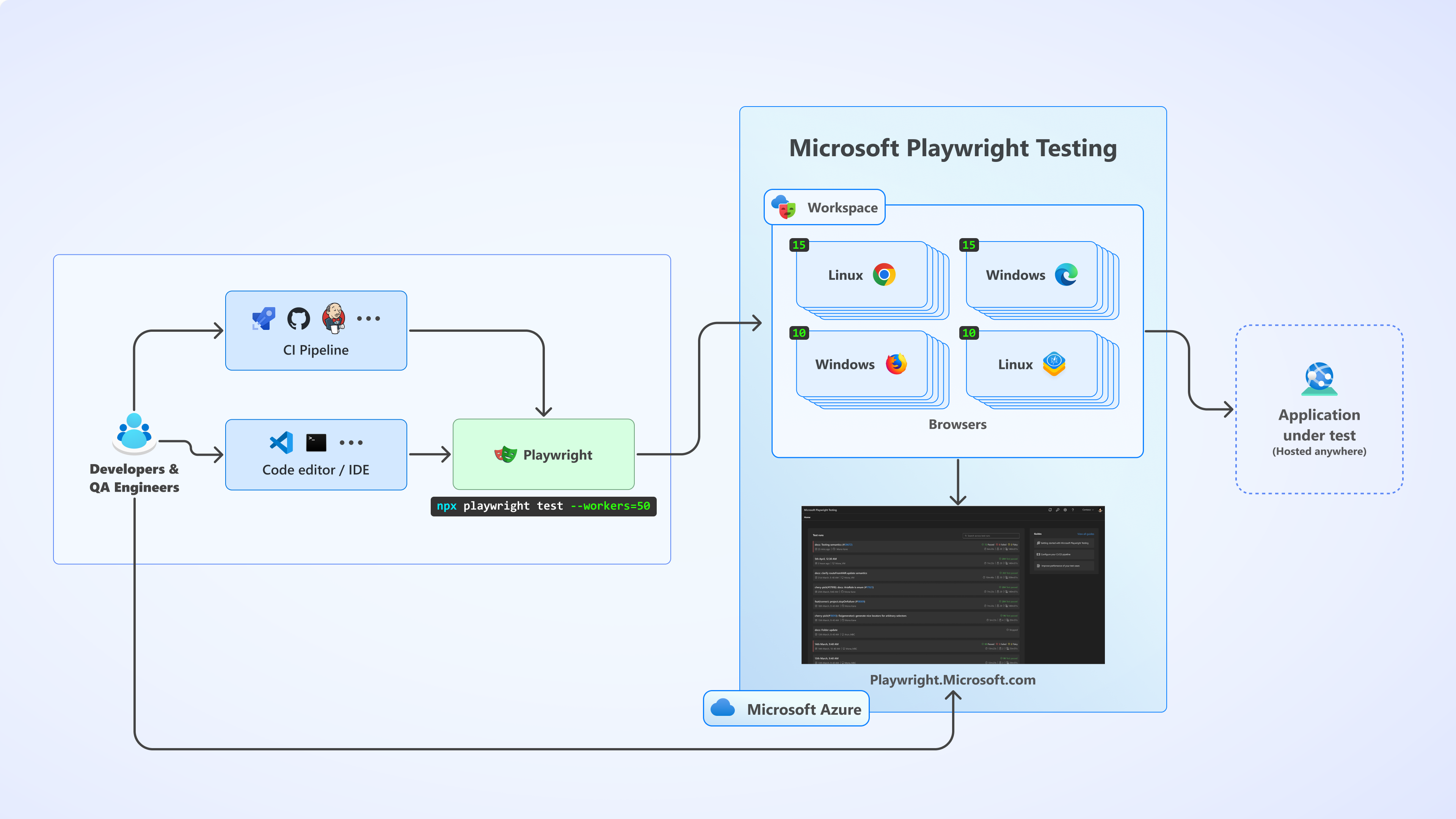 Microsoft Playwright Testing Preview is a fully managed service for end-to-end testing built on top of Playwright. With Playwright, you can automate end-to-end tests to ensure your web applications work the way you expect it to, across different web browsers and operating systems. The service abstracts the complexity and infrastructure for running Playwright tests and managing results and artifacts. The service runs tests with high parallelization and stores test results and artifacts to help you ship features faster and troubleshoot easily.