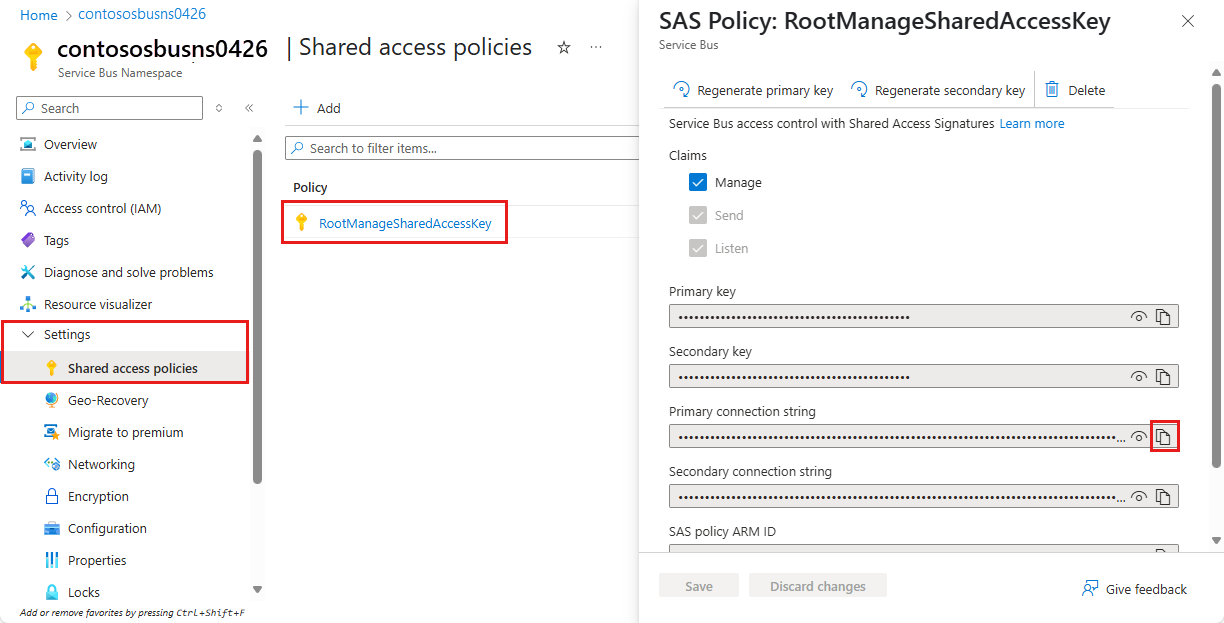 On the Service Bus Namespace page, expand Settings, then select Shared access policies.