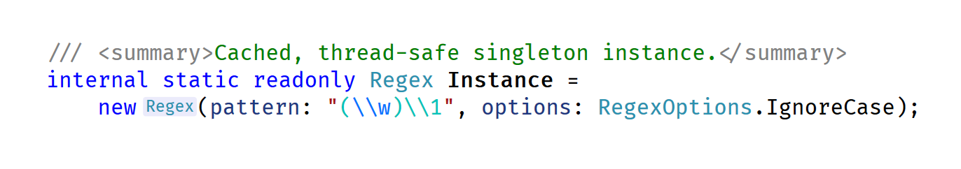 The following image is a screen capture of the source generated cached instance, internal to the Regex subclass that the source generator emits: