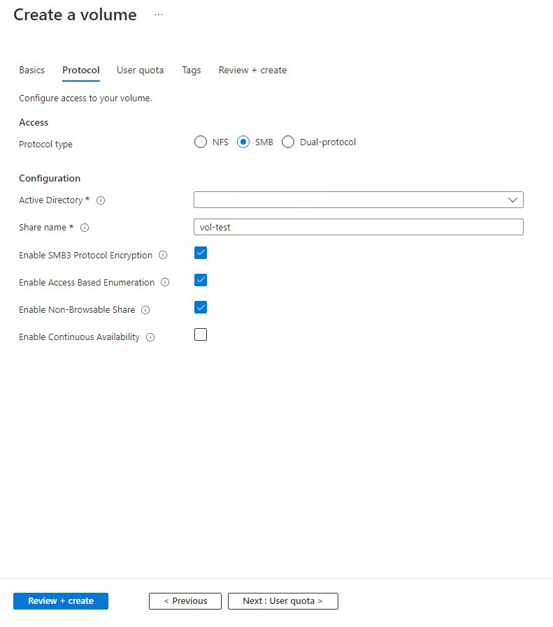 This article shows you how to create an SMB3 volume. For NFS volumes, see Create an NFS volume. For dual-protocol volumes, see Create a dual-protocol volume.