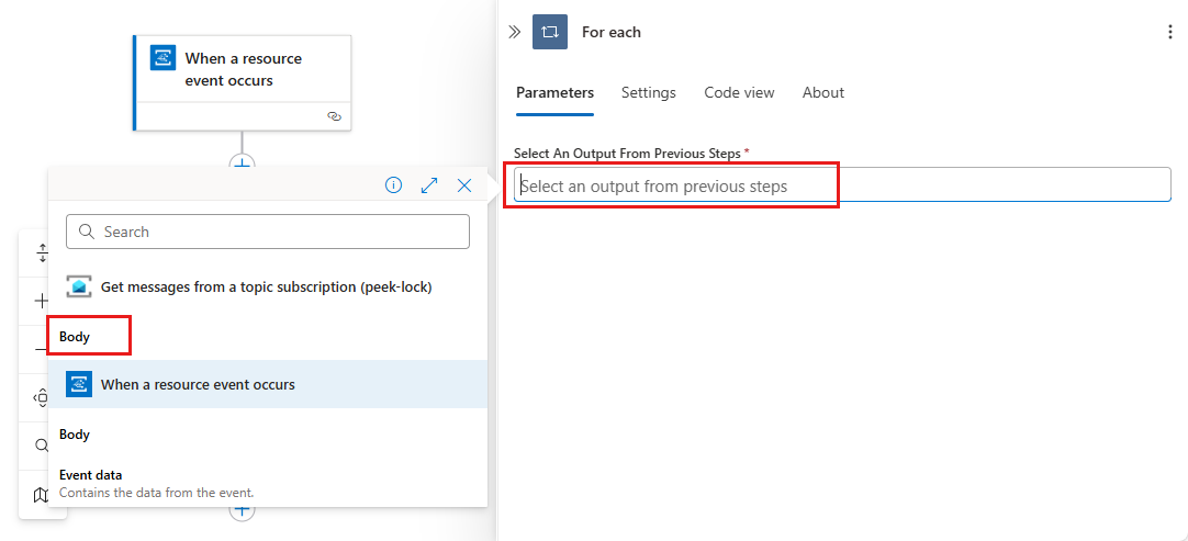 For Select an output from previous steps, select the lightning bolt or enter / and select Insert dynamic content.