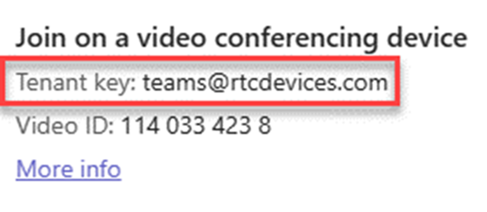 The tenant key is the dial out to the partner service. In the following example, 'teams@rtcdevices.com' is the tenant key.