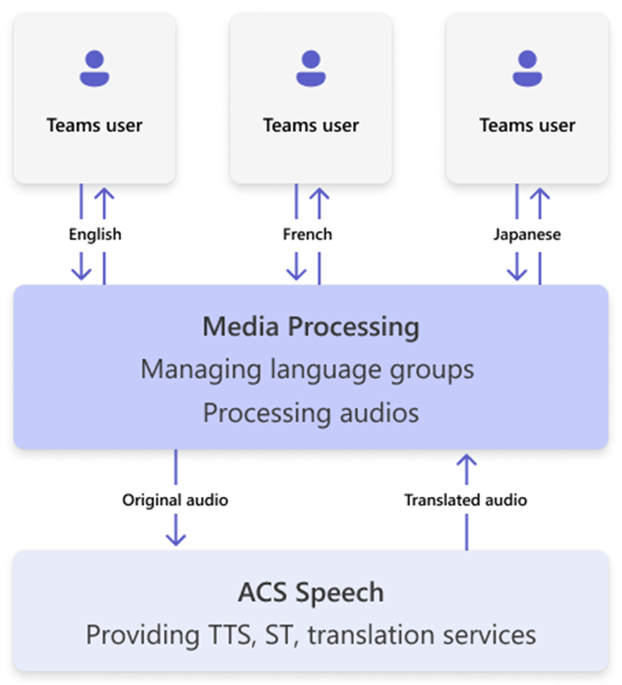 Interpreter performs real-time speech-to-speech (STS) translation using Azure Cognitive Services, supporting multi-speaker, mixed-language conversations in Teams meetings. Here's how it works: