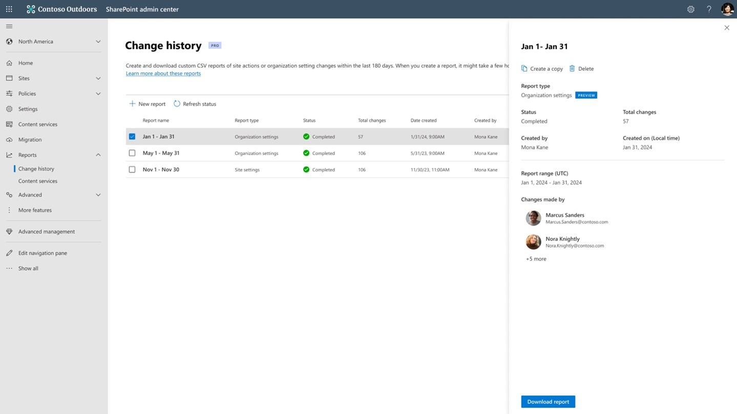 Create up to 10 reports that track what changed, when it happened, and who initiated the change across the site and organization settings.