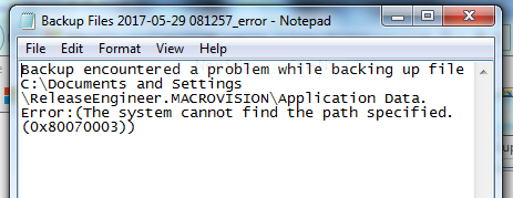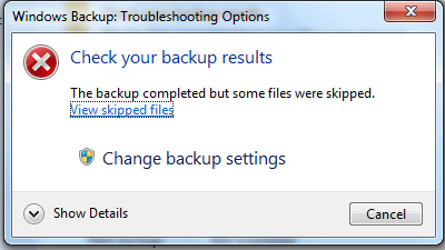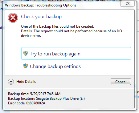 Attempted backup again and got same (original) message - "One of the backup files could not be created due to an I/O device error.