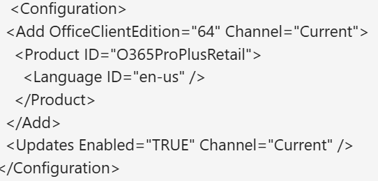 >>> Open the file in Notepad and paste the following text into it. This configuration tells Office to install the latest version from the Current Channel, which is the standard stable release.
