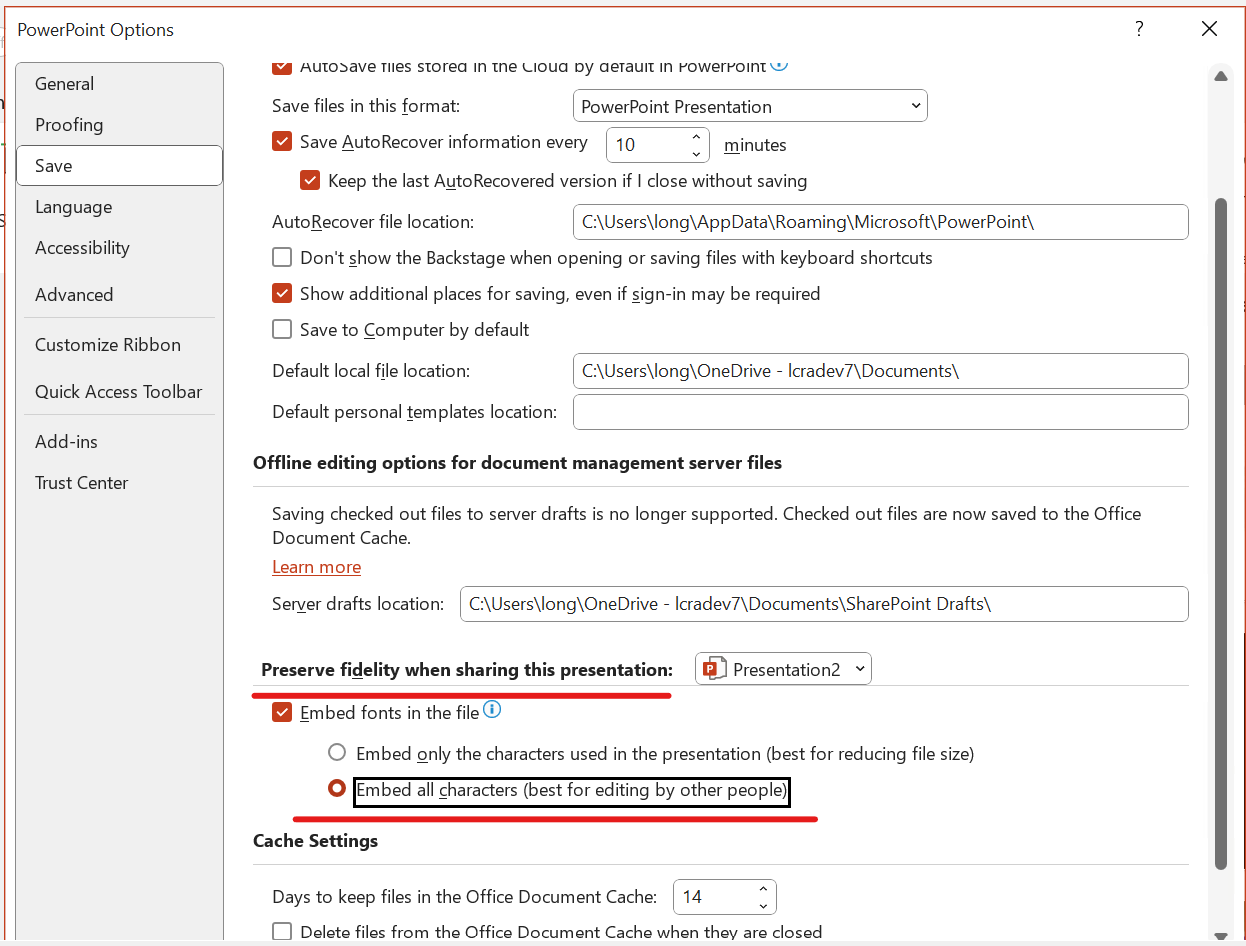 To fix this, you can embed the fonts into your presentation before sending it. Go to File > Options > Save, then check Embed fonts in the file and choose Embed all characters. This ensures the presentation looks the same on any device.