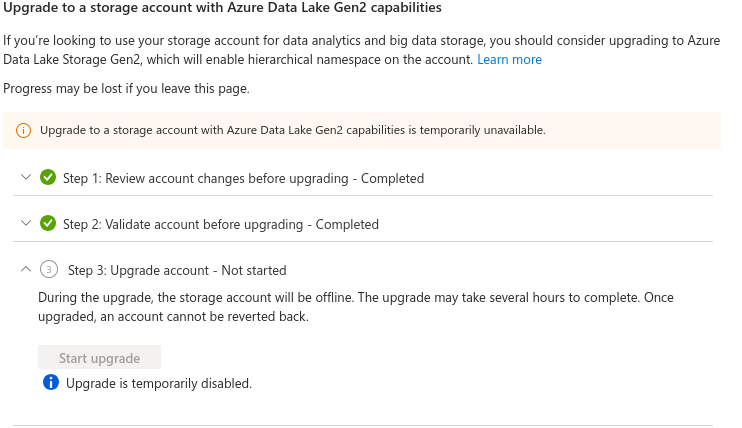 As per my understanding you are going to upgrade your Storage Account to enable Data Lake Gen2 capabilities, but you’re stuck at the final step with the message “Upgrade is temporarily disabled.” Although the first two steps pass fine, this last step refuses to start the upgrade.