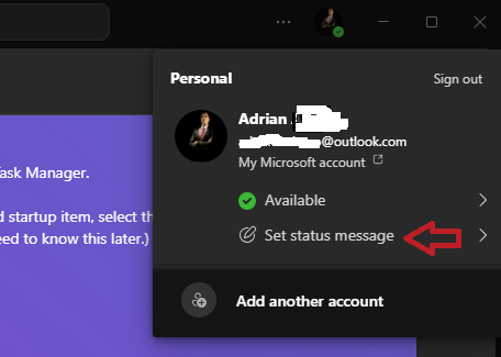 If this is showing on your own Teams profile and not a contact, and you’re not part of an organization, it’s likely your status message. You can edit or clear it by clicking your profile picture > Set status message" or Edit message. Screenshot 2025-09-28 163040.png