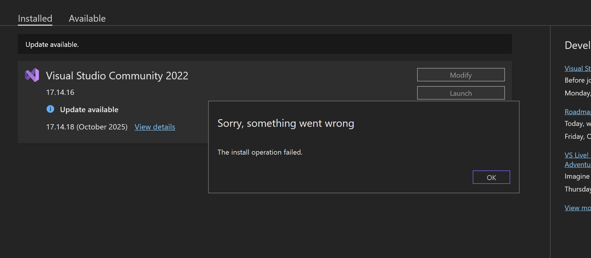 · Try to update Visual Studio again through the newly installed visual studio installer.