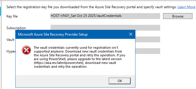 you gave a new server the same name as an old one that was previously replicated, and now asr is confused. the old server's metadata is still lingering in the recovery services vault, blocking the new one.