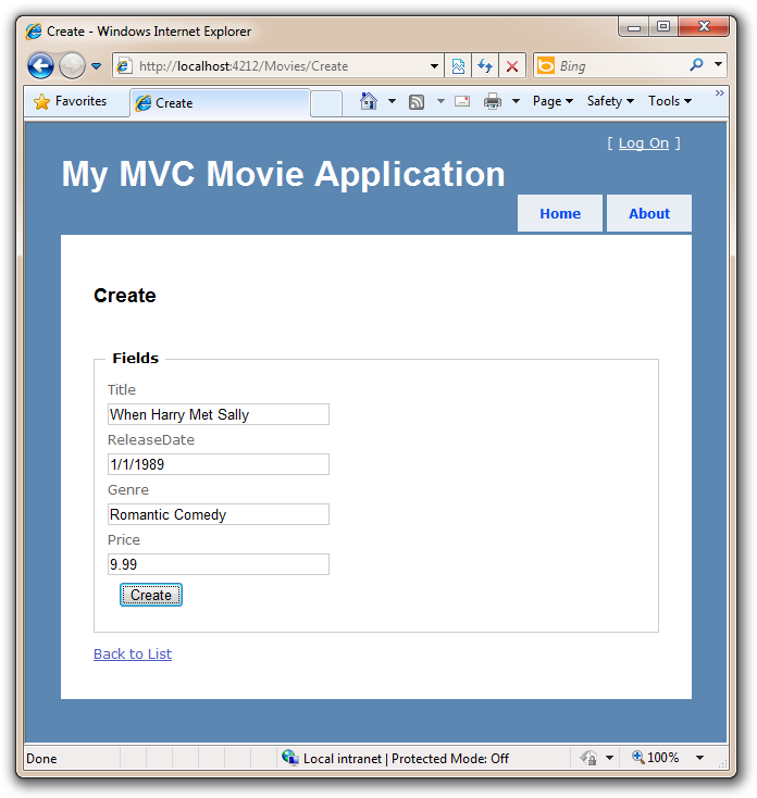 In this section we are going to implement the support necessary to enable users to create new movies in our database. We'll do this by implementing the /Movies/Create URL action.