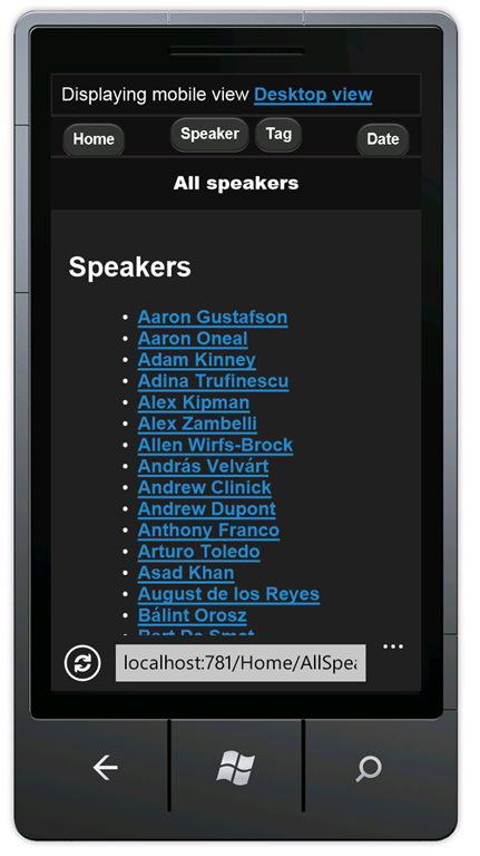 In the mobile browser, select the Speakers link. Because there's no mobile view(AllSpeakers.Mobile.cshtml), the default speakers display (AllSpeakers.cshtml) is rendered using the mobile layout view (_Layout.Mobile.cshtml).