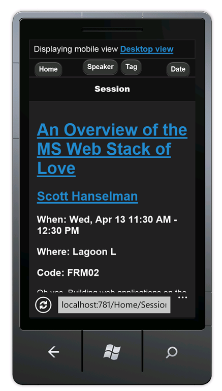 As you can see, the display is difficult to read on a mobile browser. The date column is hard to read and the tags column is out of the view. To fix this, copy Views\Home\SessionsTable.cshtml to Views\Home\SessionsTable.Mobile.cshtml, and then replace the contents of the file with the following code: