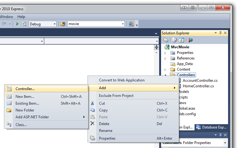 Let's begin by creating a controller class. In Solution Explorer, right-click the Controllers folder and then select Add Controller.