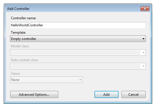 Name your new controller "HelloWorldController". Leave the default template as Empty controller and click Add.