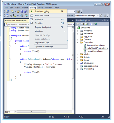 Next, you need a Welcome view template! In the Debug menu, select Build MvcMovie to make sure the project is compiled.
