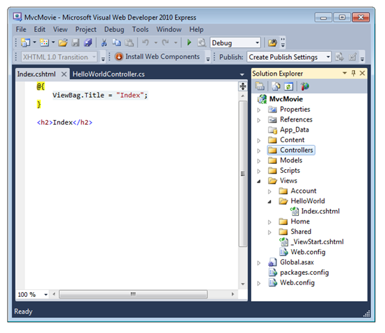 The MvcMovie\Views\HelloWorld folder and the MvcMovie\Views\HelloWorld\Index.cshtml file are created. You can see them in Solution Explorer: