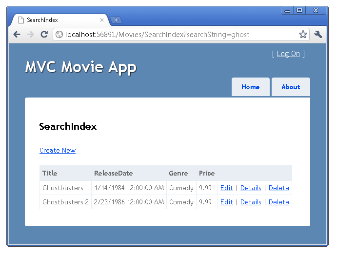 In this section, you'll examine the generated action methods and views for the movie controller. Then you'll add a custom search page.