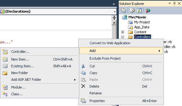 Create a new controller by right-clicking the Controllers folder in Solution Explorer and then selecting Add Controller.
