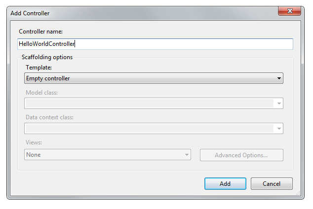 Name your new controller "HelloWorldController" and click Add.