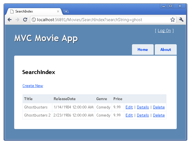 In this section, you'll examine the generated action methods and views for the movie controller. Then you'll add a custom search page.