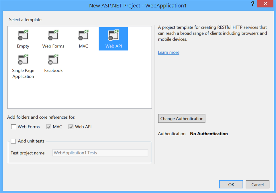 First, we'll create a new ASP.NET Web Application project. In Visual Studio, from the File menu, select New > Project. Under Templates, Web, select ASP.NET Web Application.