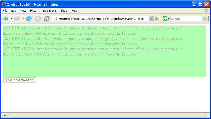 Note that there is no <Animations> node within the AnimationExtender control. Custom JavaScript code is used to provide the animations to be used with the control.