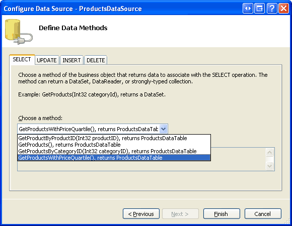 With the BLL addition complete we re ready to create an ASP.NET page that shows the price quartile for each product. Open the AddingColumns.aspx page in the AdvancedDAL folder and drag a GridView from the Toolbox onto the Designer, setting its ID property to Products. From the GridView s smart tag, bind it to a new ObjectDataSource named ProductsDataSource. Configure the ObjectDataSource to use the ProductsBLLWithSprocs class s GetProductsWithPriceQuartile method. Since this will be a read-only grid, set the drop-down lists in the UPDATE, INSERT, and DELETE tabs to (None) .