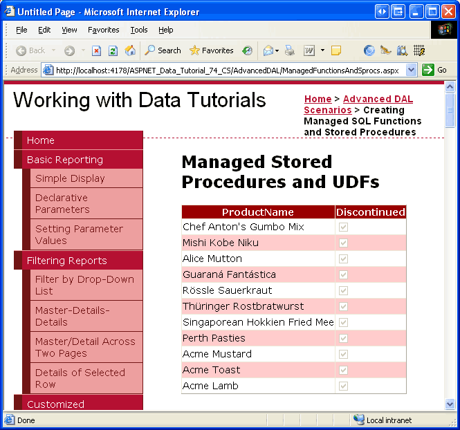 Managed database objects are best suited for stored procedures and UDFs that use procedural logic rather than set-based logic. Procedural logic involves working with sets of data on a row-by-row basis or working with scalar data. The GetDiscontinuedProducts method we just created, however, involves no procedural logic. Therefore, it would ideally be implemented as a T-SQL stored procedure. It is implemented as a managed stored procedure to demonstrate the steps necessary for creating and deploying managed stored procedures.