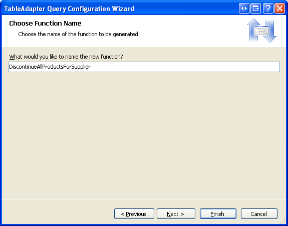 After entering this query and clicking Next, the last wizard screen asks for the new method s name use DiscontinueAllProductsForSupplier. Complete the wizard by clicking the Finish button. Upon returning to the DataSet Designer you should see a new method in the ProductsTableAdapter named DiscontinueAllProductsForSupplier(@SupplierID).