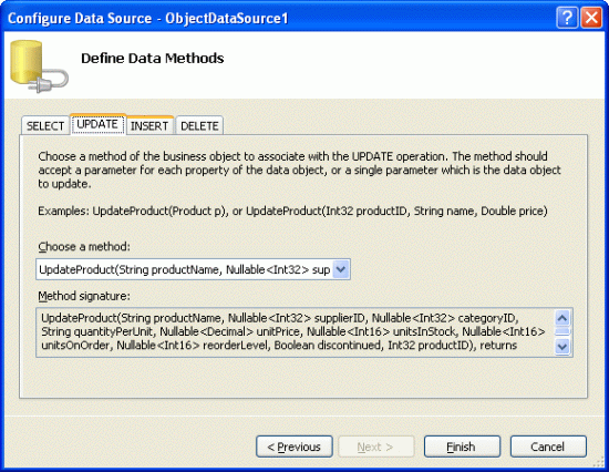 The DataObjectMethodAttribute attribute indicates the purpose of each method whether it is for selecting, inserting, updating, or deleting and whether or not it's the default value. If you omitted these attributes when creating your BLL classes, you'll need to manually select the methods from the UPDATE, INSERT, and DELETE tabs.