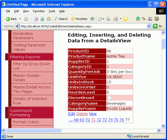 Figure 24 shows the FormView in a browser when adding a new product, Acme Coffee. Note that the SupplierName and CategoryName fields shown in the ItemTemplate are no longer present, as we just removed them. When the Insert button is clicked the FormView proceeds through the same sequence of steps as the DetailsView control, adding a new record to the Products table. Figure 25 shows Acme Coffee product's details in the FormView after it has been inserted.
