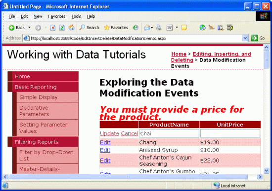 If a user attempts to save a product without specifying a price, the update is cancelled and a helpful message is displayed. While the database (and business logic) allows for NULL UnitPrice s, this particular ASP.NET page does not.