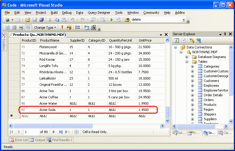 While the GridView in Figure 18 doesn't show it, the product fields lacking from the DetailsView interface CategoryID, SupplierID, QuantityPerUnit, and so on are assigned NULL database values. You can see this by performing the following steps: