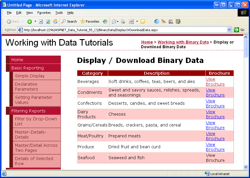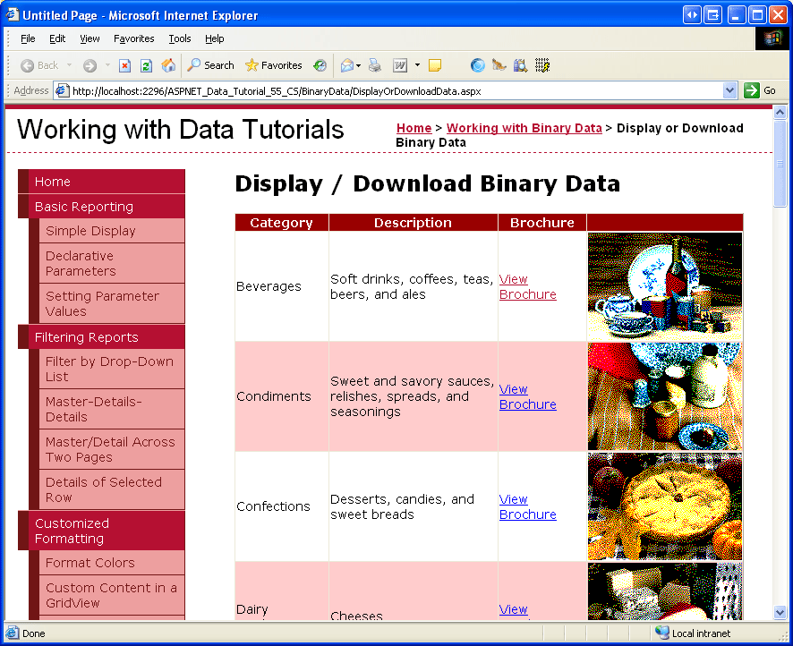 In this tutorial we examined how to present binary data. How the data is presented depends on the type of data. For the PDF brochure files, we offered the user a View Brochure link that, when clicked, took the user directly to the PDF file. For the category s picture, we first created a page to retrieve and return the binary data from the database and then used that page to display each category s picture in a GridView.