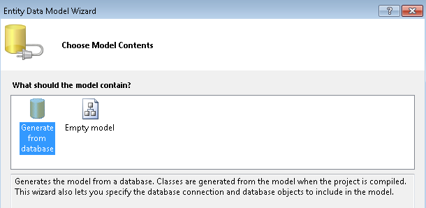 This starts the Entity Data Model Wizard. In the first wizard step, the Generate from database option is selected by default. Click Next.