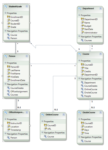 Another difference between the database diagram and the data model is the additional Navigation Properties section for each entity. A navigation property of an entity references related entities. For example, the Courses property in a Person entity contains a collection of all the Course entities that are related to that Person entity.