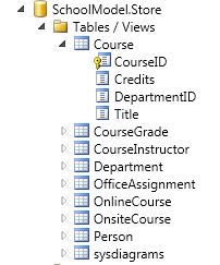 Expand SchoolModel.Store to see the tables, expand Tables / Views to see tables, and then expand Course to see the columns within a table.