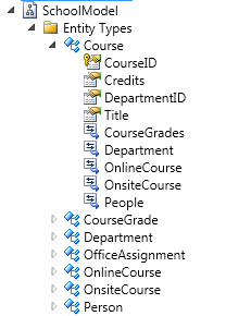 Expand SchoolModel, expand Entity Types, and then expand the Course node to see the entities and the properties within the entities.