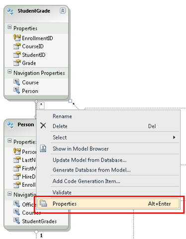 To make sure that the model keeps entities that are in memory in sync with what the database is doing, you must set corresponding rules in the data model. Open SchoolModel.edmx, right-click the association line between Person and StudentGrade, and then select Properties.