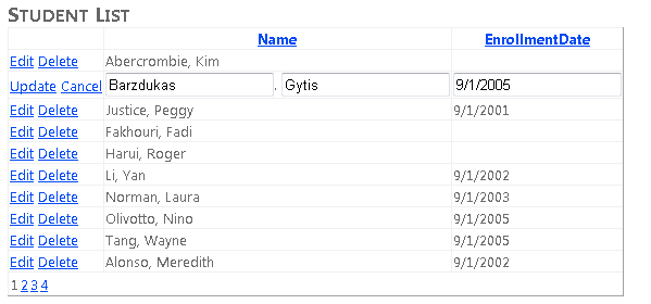 The Delete button also works. Click delete for a row that has an enrollment date and the row disappears. (Rows without an enrollment date represent instructors and you may get a referential integrity error. In the next tutorial you'll filter this list to include just students.)