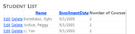 Open the Students.aspx page that you created in the previous tutorial. As currently configured, the GridView control in the page displays all the names from the People entity set. However, you want to show only students, which you can find by selecting Person entities that have non-null enrollment dates.