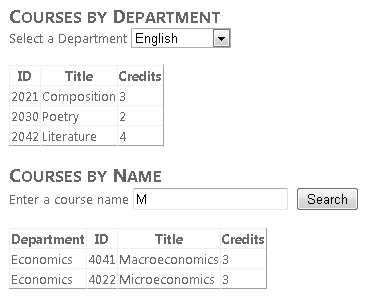 You'll change the Students.aspx page to filter for students, sort by name, and search on name. You'll also change the Courses.aspx page to display courses for the selected department and search for courses by name. Finally, you'll add student statistics to the About.aspx page.