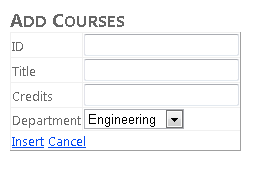 Create a new web page named CoursesAdd.aspx that uses the Site.Master master page, and add the following markup to the Content control named Content2: